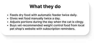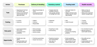 To understand how users currently manage their pet feeding routines, I created as-is journey maps based on five key actions: Purchase, Handling & Delivery, Inventory Control, Feeding Habit, and Health Records. Each user navigates these stages differently depending on their lifestyle, preferences, and pet needs. For example, a user who relies on online ordering with autoship never visits a physical store or carries heavy bags home, while another may prefer in-store purchases to ensure quality and availability.