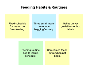 Feeding routines vary significantly by pet type (dog vs. cat), health conditions, activity level, and owner experience. Some follow fixed meal schedules using kitchen scales or smart feeders, while others free-feed with set limits or occasional flexibility.