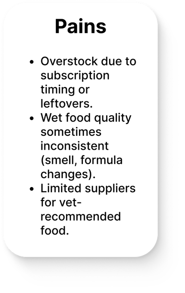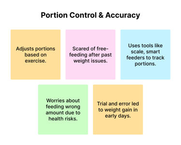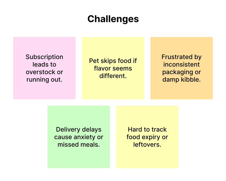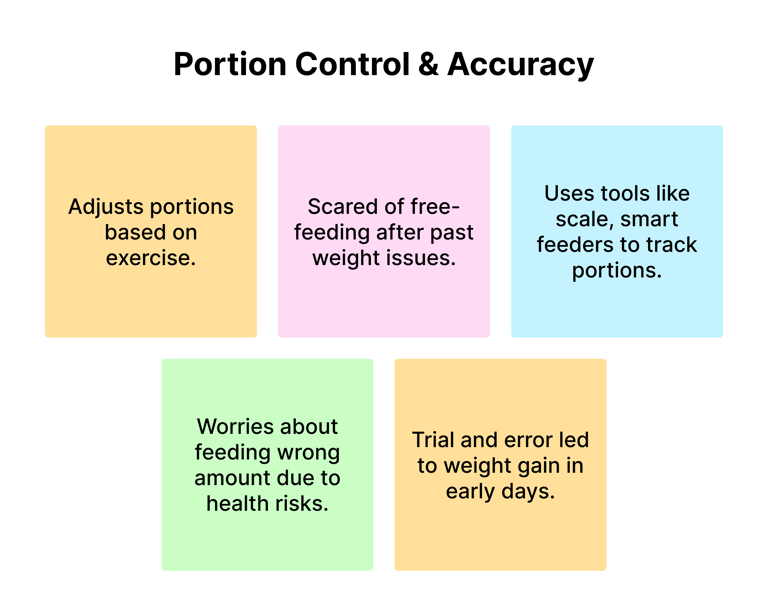 New and experienced pet owners alike often face uncertainty around how much and how often to buy pet food and feed their pets, especially when considering factors like age, weight, breed, and specific health conditions. The key pain points identified are outlined below; the following section explains the research process that led to these findings.