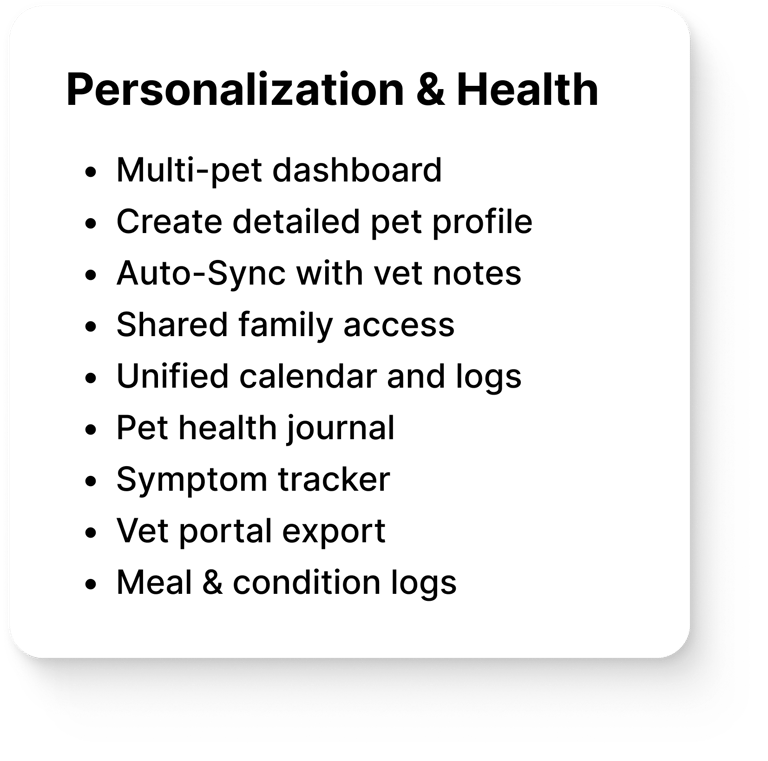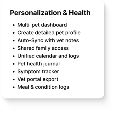 Pet parents managing chronic conditions or special diets need a way to store, update, and reference their pet’s health data easily so they can make informed feeding decisions and support vet visits without friction.