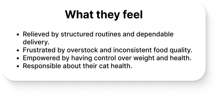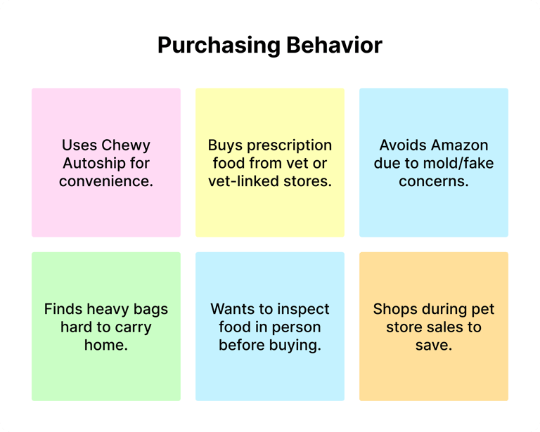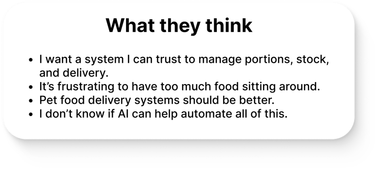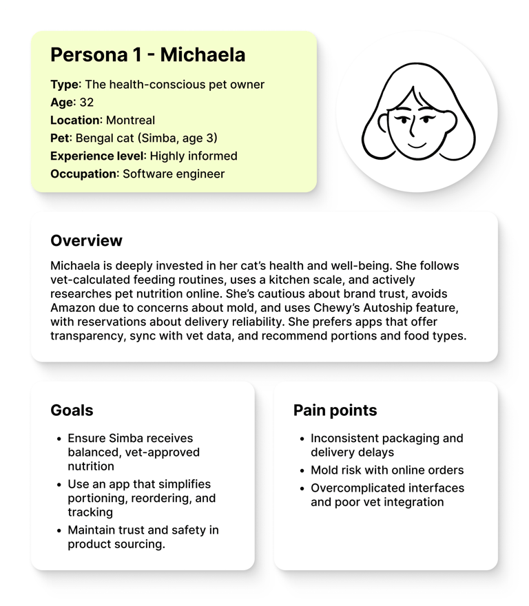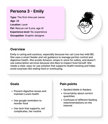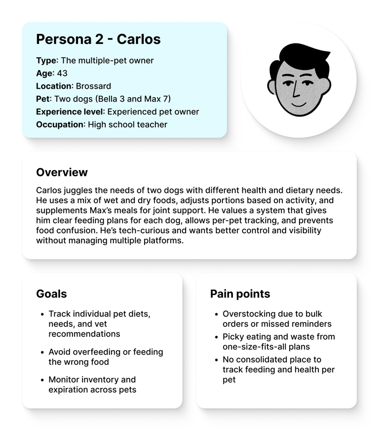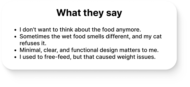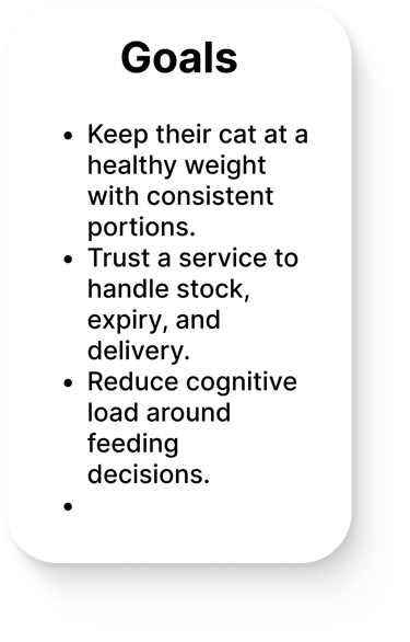 Through user interviews and synthesis, I uncovered a range of overlapping yet distinct needs among pet owners. These insights revealed challenges in feeding routines, reordering logistics, inventory control, and health tracking. To address these pain points and guide the design process, I defined four core design goals focused on personalization, simplicity, transparency, and support for multi-pet households.