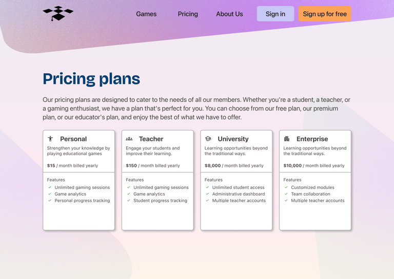 The original blue palette was replaced with warm tones (purple, orange, soft pink) to create a more inviting, playful, and educational feel—moving away from a cold, corporate look.
