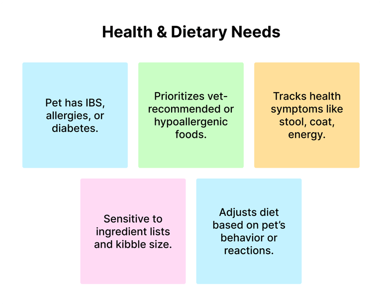 Health-conscious owners (e.g., diabetic dogs or cats with IBS) follow stricter routines and rely heavily on vet advice and prescription diets.