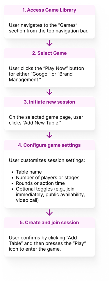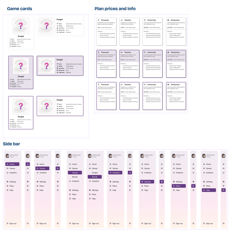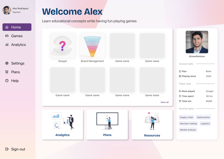 Created a dashboard for each user that gives them a central hub to manage their games, track learning progress, and access key resources and analytics. This not only reduced navigation friction and supported deeper engagement but also ensured scalability as the platform evolves with more games and features.